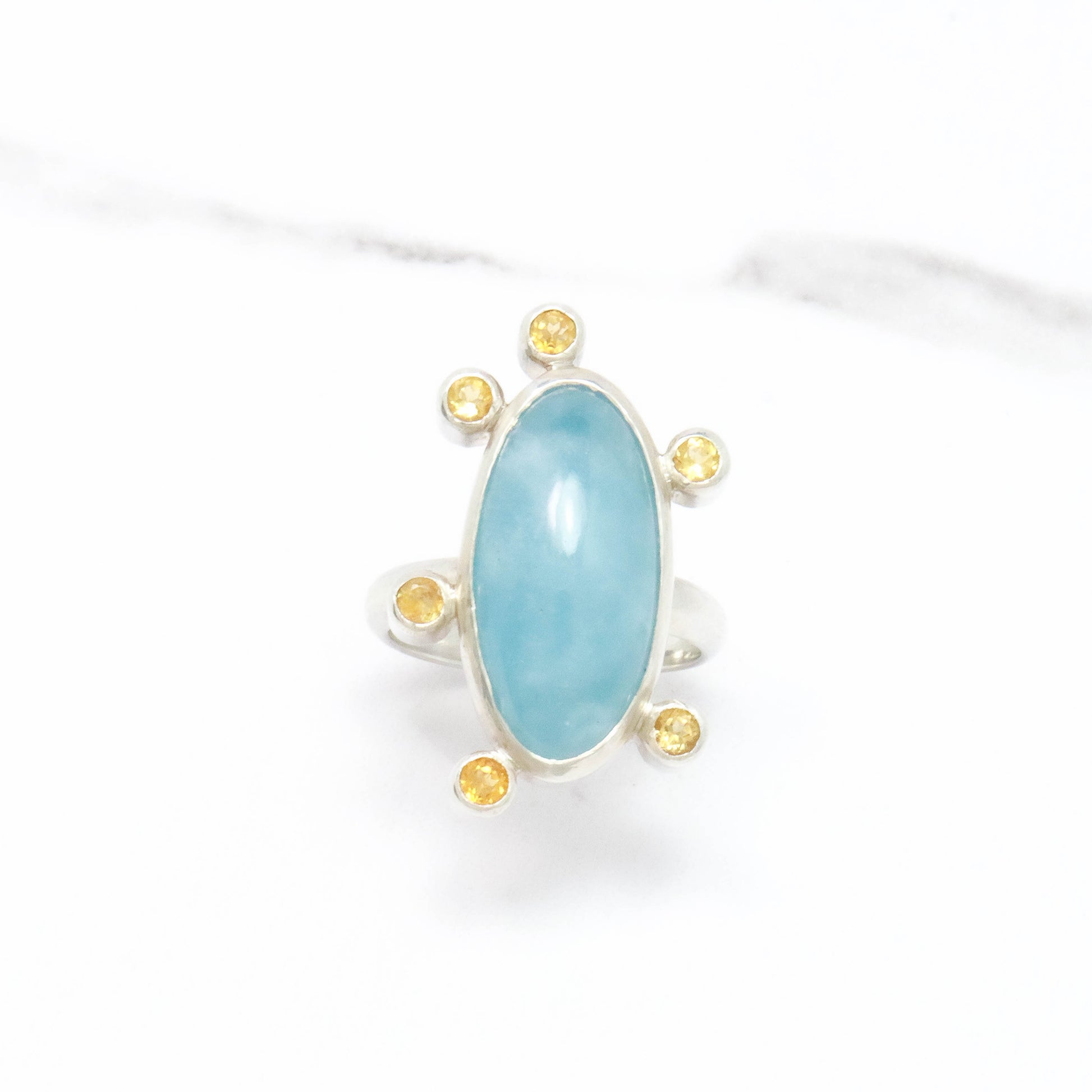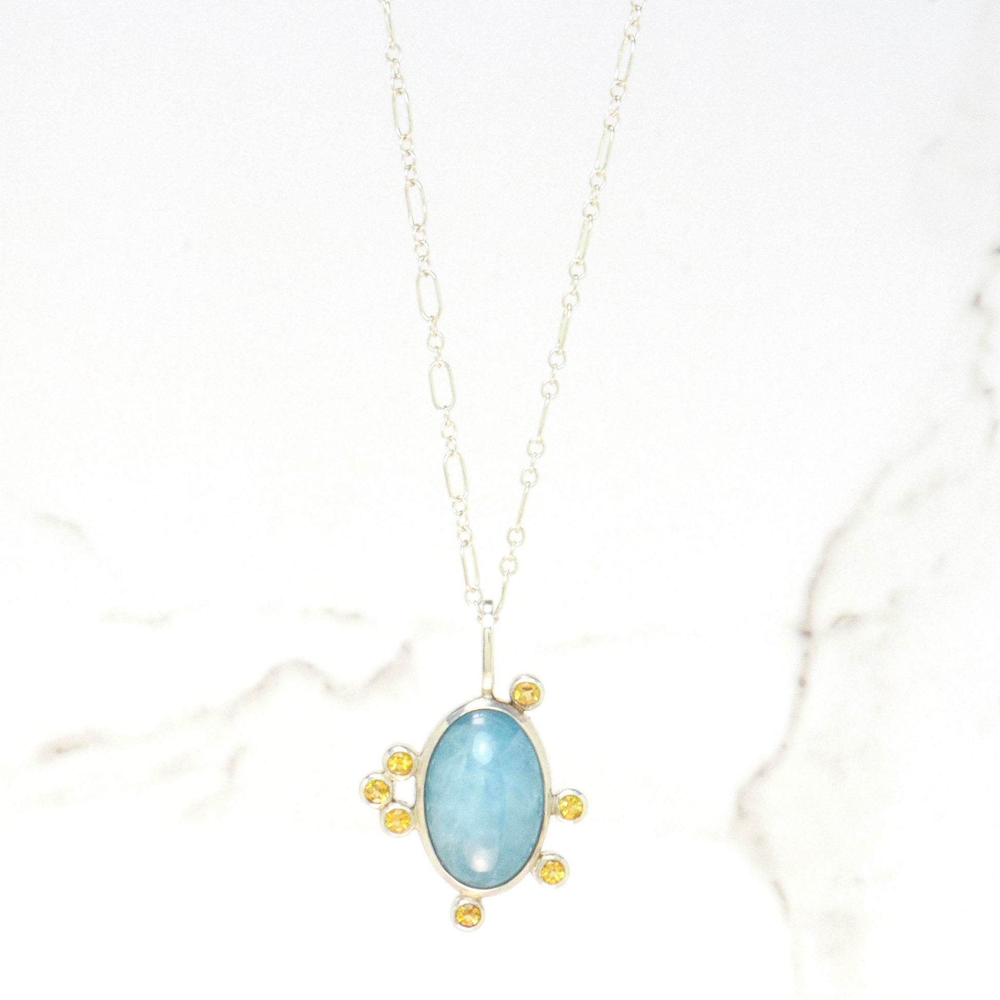 Citrine gemstones carefully orbit around large Aquamarine for a